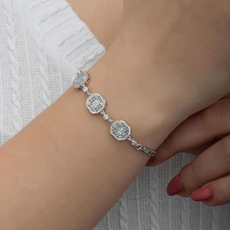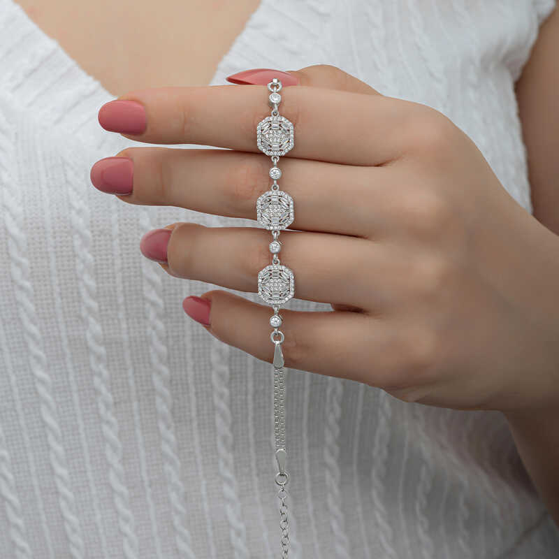 Modaya uyumlu sekilde tasarlanan gumus baget bileklik modellerini hem gundelik yasantinizda hem ozel gun ve gecelerinizde sik bir sekilde kullanabilirsiniz. Yenilikci her yastan kadinin begenisine hitap eden urunlerle kombinlerinizi tamamlayabilirsiniz. Her biri farkli bir stile hitap edebilen tasarimlarla sizler de spor, klasik ve alternatif giyim tarzlariniza uygun modellerimizi tercih edebilirsiniz. Bu sik bileklik; dogum gunu hediyesi, sevgililer gunu hediyesi veya ozel gunlerde tercih edilebilecek mukemmel bir secenektir. Gumus baget tasli kadin bileklik 925 ayar gumusten imal edilmistir. Bu bileklik uzerine rodyum kaplama yapilmistir. Rodyum kaplama yapilan urunler parlakligini uzun sure muhafaza eder, oksitlenmesini geciktirir. Tum gumus kadin bileklik modellerinde oldugu gibi gumus baget tasli kadin bileklik modeli de el emegi ile uretilmistir. Gumus ve degerli taslar nedeniyle belirtilen ortalama urun agirliginda ± %10 sapma olabilmektedir.