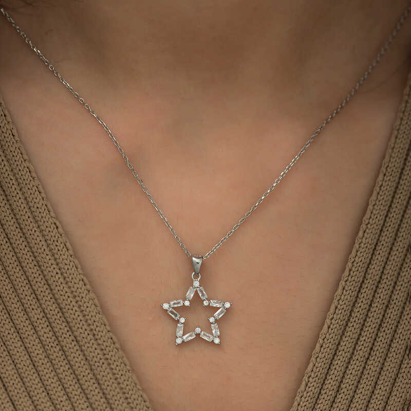 Yildiz, pek cok toplumda ve ogretide sans getirildigine inanilan ugurlu bir semboldur. Venus Gezegeninin enerjisini tasir. Venus Gezegeni, ask ve ask enerjisinin de temsilcisidir. Bu sik baget taslardan olusan yildiz kolye; dogum gunu hediyesi, sevgililer gunu hediyesi veya ozel gunlerde tercih edilebilecek mukemmel bir secenektir. Gumus baget tasli yildiz kolye 925 ayar gumusten imal edilmistir. Bu kolye uzerinde rodyum kaplama vardir. Rodyum kaplama yapilan gumus kolye modelleri parlakligini uzun sure muhafaza eder. Tum gumus kolye modellerimizde oldugu gibi gumus baget tasli yildiz kolye modeli de el emegi ile uretilmistir. Gumus ve degerli taslar nedeniyle belirtilen ortalama urun agirliginda ± %10 sapma olabilmektedir.
