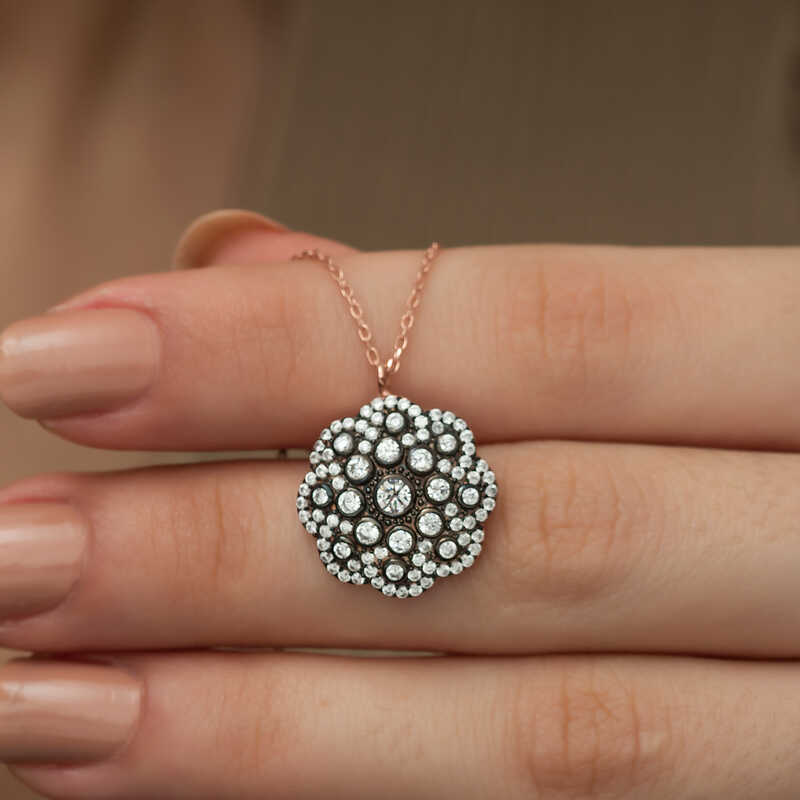 Isiltiyi ve gosterisi yansitan gumus elmas montur tasarim kolyeler sikliginiza siklik katmayi hedefliyor. Modern olarak dizayn edilen gumus elmas montur cicek desenli kolyeler, kadinsi zarafetinizi on plana cikaracak. Bu kolyeler hem gunluk kullanimda hem de ozel davetlerde guzelliginiz ile butunleserek goz alici sikligi gozler onune seriyor. Elmas sikligi, her yasta ve her yerde aski, tutkuyu, canliligi yasatmaya devam ediyor. Gosterisiyle hayranlik uyandiran veya sade sik tasarimiyla kadinsi inceligi on plana cikaran birbirinden guzel gumus kolyeler sizleri bekliyor. Gumus uzerine rose kaplama yapilmistir. Rose kaplama yapilan gumus bayan kolye modelleri parlakligini uzun sure muhafaza eder ve oksitlenmesi gecikir. Gumus kolye modeli uzerinde bulunan taslar zirkondur. Gumus olan zincirin boyu ortalama 45 cm'dir. Bu elmas montur cicek kolye el emegi ile uretilmistir. Gumus ve degerli taslar nedeniyle belirtilen urun agirliginda ± %10 sapma olabilmektedir.