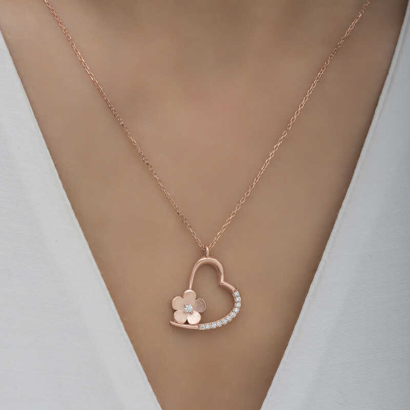 Kalp simgesi daima kosulsuz sevginin ve askin sembolu olmustur. Dini ogretilerde ise kalbin gucu sinirsizdir. Cunku kalp Yaradanin evi, bizim ise evrene acilan gerceklik kapimizdir. Bu sik gumus cicekli kalp kolye; dogum gunu hediyesi, sevgililer gunu hediyesi veya annelere hediye olarak ozel gunlerde tercih edilebilecek mukemmel bir secenektir. Gumus cicekli kalp kadin kolye 925 ayar gumusten imal edilmistir. Bu kolye uzerinde rose kaplama yapilmistir. Rose kaplama yapilan gumus kadin kolye modelleri parlakligini uzun sure muhafaza eder. Uzerinde bulunan taslar zirkondur. Tum gumus kadin kolye modellerimizde oldugu gibi gumus cicekli kalp kadin kolye modeli de el emegi ile uretilmistir. Gumus ve degerli taslar nedeniyle belirtilen ortalama urun agirliginda ± %10 sapma olabilmektedir.