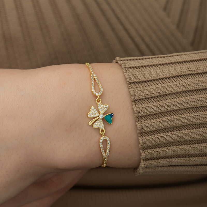 Dort yaprakli yonca butun kulturlerde iyi sansin sembolu olarak kabul edilir. Yoncanin dort yapraginin da ayri birer anlami vardir. Birinci yaprak umidi, ikincisi imani, ucuncusu aski, dorduncu yaprak ise sansi simgeler. Dort kalbin birlesmesiyle olusan ozel tasarim bayan bileklik modeli 925 ayar gumusten imal edilmistir. Bu zarif bileklik genc asiklarin ozel gunlerde tercih edebilecegi cok sik bir secenek olacaktir. Gumus nazarli yonca bayan bileklik uzerinde altin kaplama vardir. Altin kaplama yapilan gumus bayan bileklikler parlakligini uzun sure muhafaza eder, gumuse sari rengi verir ve oksitlenmesini geciktirir. Gumus gold nazarli yonca bayan bileklik sizin oldugu kadar sevdiklerinizin de keyifle takacagi en guzel hediyelerden biri olacaktir. Tum gumus bayan bileklik modellerimizde oldugu gibi gumus gold nazarli yonca bileklik de el emegi ile uretilmistir. Gumus ve degerli taslar nedeniyle belirtilen urun agirliginda ± %10 sapma olabilmektedir.