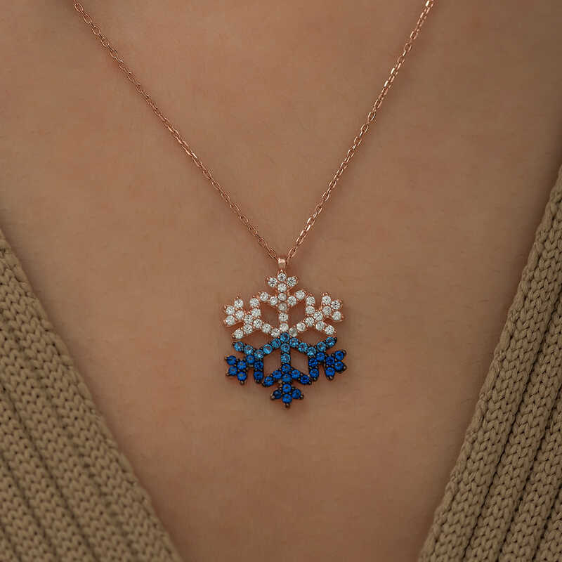 Kadinlarin isiltisi, berrakligi kar tanesine benzetilip ozel olarak tasarlanmistir. Kar tanelerinin her birinin kadinlar gibi essiz ve ayri kiymette olmasi onlari ozel kilan bir diger ozelliktir. Asilligi her donemde dikkat cekmeyi basarmistir. Bunun yaninda insanlarin tipki kar taneleri gibi birbirlerine zarar vermeden de mutlu bir sekilde yasayabileceklerini sembolize etmektedir. Bu sik kolye; dogum gunu hediyesi, sevgililer gunu hediyesi veya annelere hediye olarak ozel gunlerde tercih edilebilecek mukemmel bir secenektir. Kolye, 925 ayar gumusten imal edilmistir. Gumus uzerine rose kaplama yapilmistir. Rose kaplama yapilan urunler parlakligini uzun sure muhafaza eder ve oksitlenmesi gecikir. Tum gumus kolyelerde oldugu gibi bu gumus mavi tasli kar tanesi kolye de tamami el emegi ile uretilmistir. Gumus ve degerli taslar nedeniyle belirtilen ortalama urun agirliginda ± %10 sapma olabilmektedir.