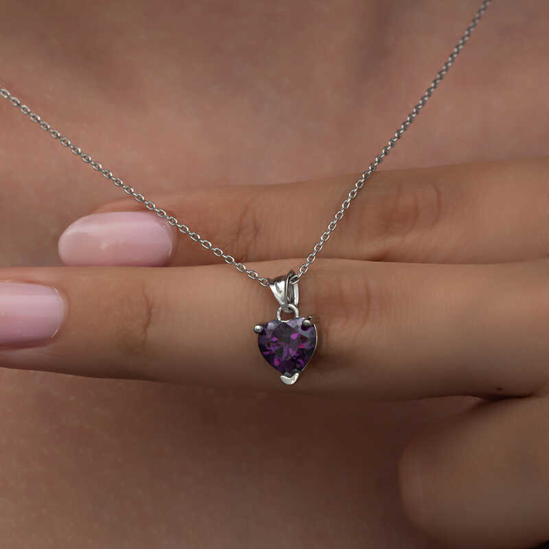 Kalp deseniyle aski ifade eden kalpli kolye modeli ile sevginiz, sevdiginiz kadinin teninde hayat bulsun. Genc sevgililerin ve kendini genc hissedenlerin ozel gunlerde secebilecegi bu kalpli kadin kolye ile sevdiginizi askla susleyin. Sizin oldugu kadar sevdiklerinizin de keyifle takacagi kalp desenli kolye sevdiginize en guzel hediyelerden biri olacaktir. Kalpli kadin kolye 925 ayar gumusten imal edilmistir. Gumus uzerine rodyum kaplama yapilmistir. Rodyum kaplama yapilan gumus kadin kalpli kolyeler parlakligini uzun sure muhafaza eder ve oksitlenmesi gecikir. Kolye uzerinde bulunan tas zirkondur. Gumus olan zincir boyu ortalama 50 cm'dir. Tum kadin kolyelerde oldugu gibi gumus mor tasli kalpli kadin kolye de el emegi ile uretilmistir. Gumus ve degerli taslar nedeniyle belirtilen ortalama urun agirliginda ± %10 sapma olabilmektedir.