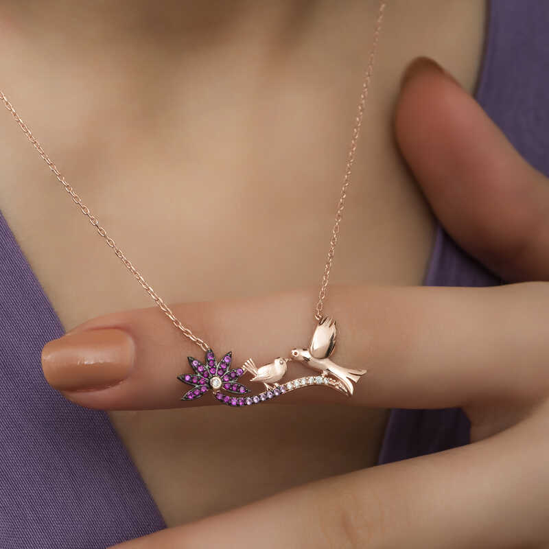 925 Ayar ​Gumus Rose Anne Ve Yavru Kus Kadin Gumus Kolye