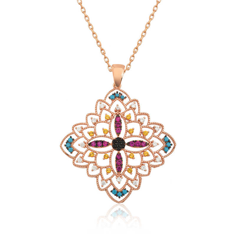 Renkli zirkon taslar ile suslenmis etnik desenli madalyon kolye, sik ve isiltiyi sevenler icin tasarlandi. Gunun her aninda severek kullanabileceginiz, herkesin begenisini toplayabilecek ve goz kamastirabilecek bir urundur. Gumus etnik desenli madalyon bayan kolye 925 ayar gumusten imal edilmistir. Bu kolye uzerine rose kaplama yapilmistir.Rose kaplama yapilan urunler parlakligini uzun sure muhafaza eder ve gumusu bakir rengine donusturur. Uzerinde bulunan taslar zirkon'dur. Tum gumus bayan kolye modellerinde oldugu gibi gumus etnik desenli madalyon bayan kolye modeli de el emegi ile uretilmistir. Gumus ve degerli taslar nedeniyle belirtilen ortalama urun agirliginda ± %10 sapma olabilmektedir.Urunlerimizin tamami el emegi ile uretilmistir.