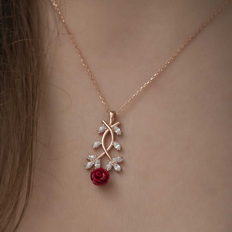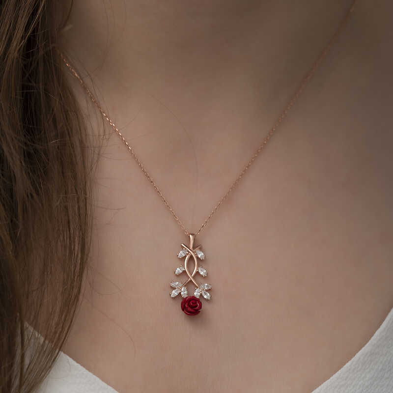 Havalarin isinmasiyla birlikte canlanan doga, ilkbaharin geldigini mujdeler. Yesile burunen agaclar, rengarenk cicekler acar ve essiz kokulari ile bizi karsilar. Dogadan ilham alinarak tasarlanan bu kolye yeniden dogusu ilkbahari sembolize etmektedir. Bu sik kolye; dogum gunu hediyesi, sevgililer gunu veya ozel gunlerde tercih edilebilecek mukemmel bir secenektir. Kolye; 925 ayar gumusten imal edilmistir.Gumus uzerine rose kaplama yapilmistir.Rose kaplama yapilan urunler gumuse pembe bakir rengi verir. Diger kolyelerde oldugu gibi gumus kirmizi gul kolye de el emegi ile uretilmistir. Gumus ve degerli taslar nedeniyle belirtilen ortalama urun agirliginda ± %10 sapma olabilmektedir.