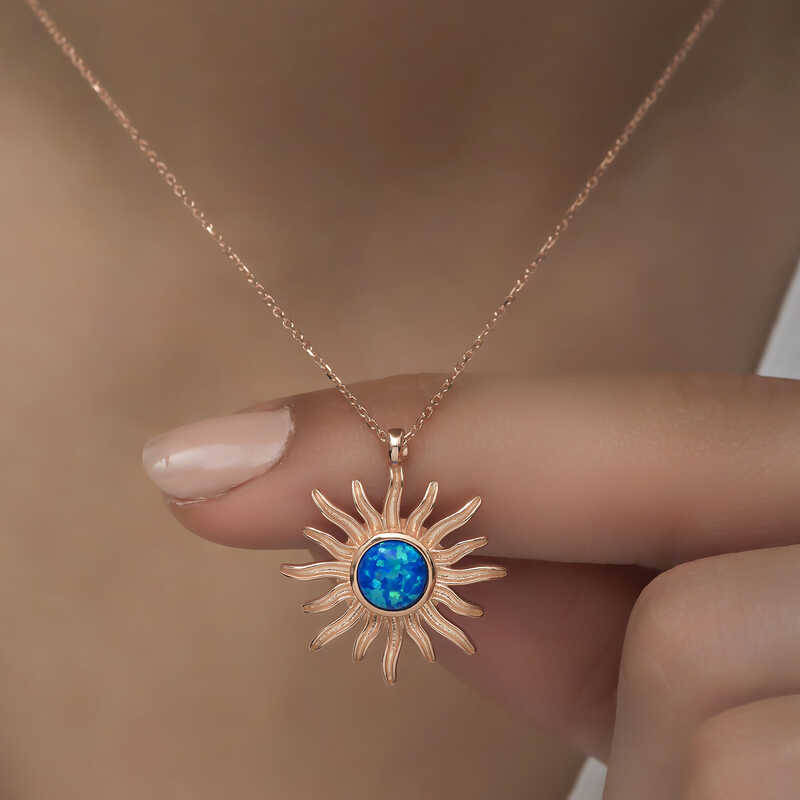 925 Ayar Gumus Rose Mavi Opal Tasli Gunes Kadin Kolye