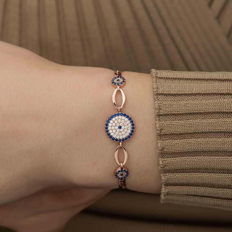 Nazar boncugunu insanlar uzun yillardan beri kotu bakistan korunmak icin kullanmislardir. Kotu bakislarin insanlar uzerinde olumsuz etki olusturmasina karsi bir onlemdir, nazar boncugu… Bu sebeptendir ki insanlar sevdiklerini korumak icin nazar boncugu takmaktadir. Bu nazar boncuklu bileklik de sikligi ve zarafeti yansitiyor. Her donem sevilen ve sikligindan odun vermeyen bu modeli ; dogum gunu hediyesi, sevgililer gunu hediyesi veya annelere hediye olarak ozel gunlerde tercih edebilirsiniz. Gumus rose nazar boncuklu bayan bileklik, 925 ayar gumusten imal edilmistir. Gumus uzerine rose kaplama yapilmistir.Rose kaplama yapilan gumus bayan bileklikler parlakligini uzun sure muhafaza eder, oksitlenmesi gecikir. Uzerinde bulunan taslar zirkondur. Tum gumus bayan bilekliklerinde oldugu gibi bu gumus rose nazar boncuklu bayan bileklik modeli de tamami el emegi ile uretilmistir. Gumus ve degerli taslar nedeniyle belirtilen ortalama  urun agirliginda ± %10 sapma olabilmektedir.