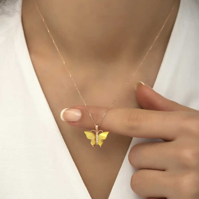 Gumus Rose Sari Kaplangozu Tasli Kelebek Kolye