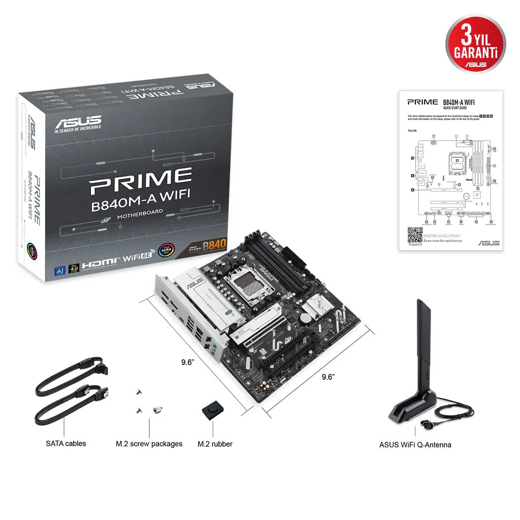 ASUS PRIME B840M-A WI-FI, 4xDDR5, 3x M.2, HDMI, 2x DP, Type-C, WI-FI 6E, Bluetooth 5.3, AMD Ryzen 9000 Serisi, AM5 Soket Anakart