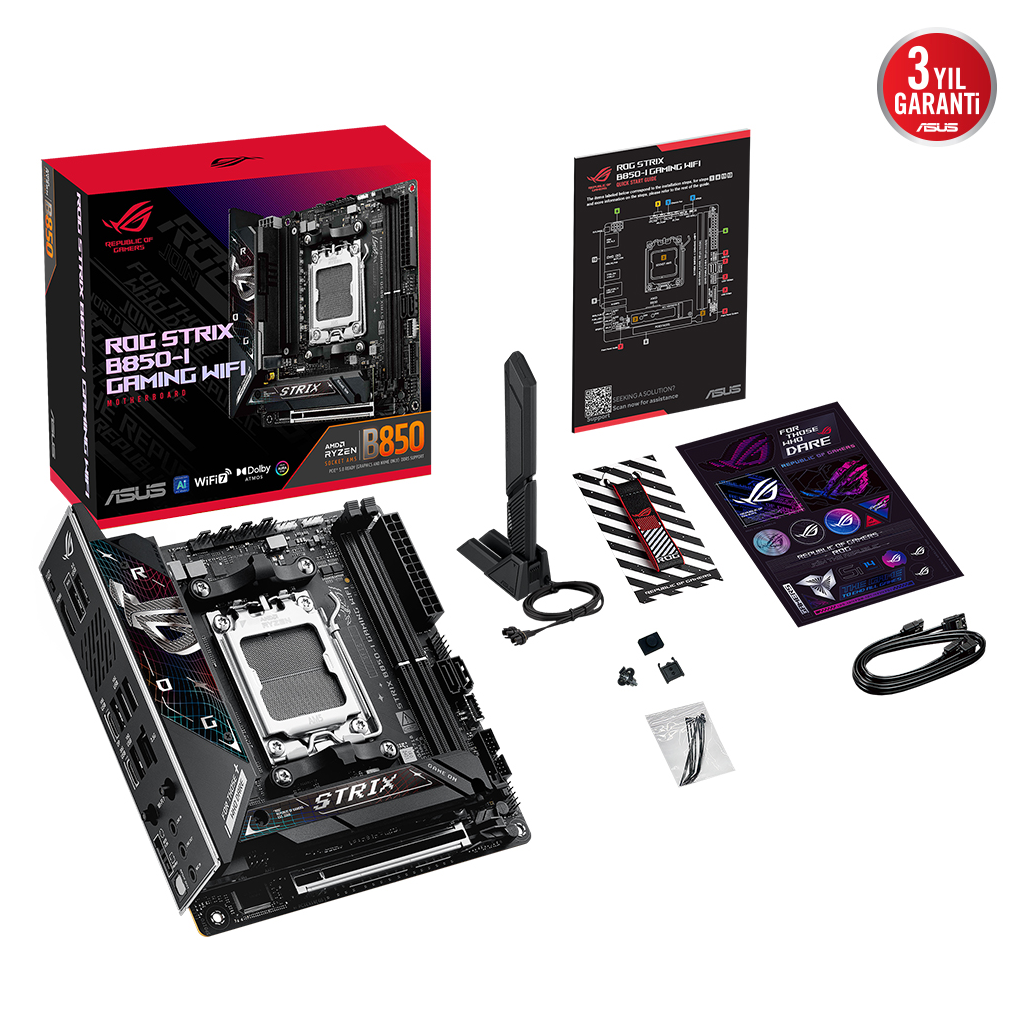 ROG Strix B850-I Gaming WiFi, 10 güç asamasi, hiper hizli DDR5 yuvalari ve PCIe® 5.0 baglantilari sunar. Ürün, iki adet adet dahili PCIe® 5.0 M.2 SSD yuvasi, USB 20Gbps Type-C® destegi, WiFi 7, ASUS AI Danisman, AI Overclocking, AI Networking II ve Aura Sync RGB aydinlatma özelliklerine sahip.
