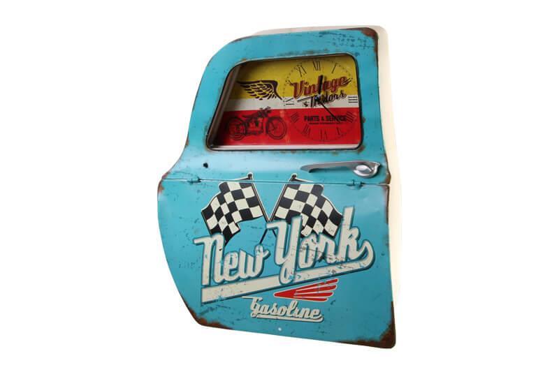 Dekoratif Newyork Temali Mavi Araba Kapisi Saatli Duvar Rafi