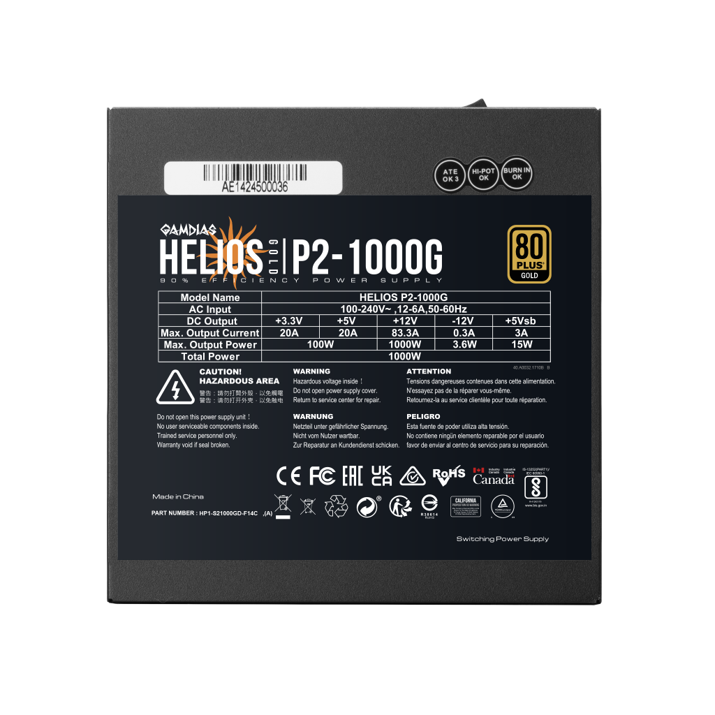 GAMDIAS HELIOS P2-1000G, 1000W, 80+ Gold, Full Moduler, Aktif PFC, GAMING, ATX, Power Supply (PSU)