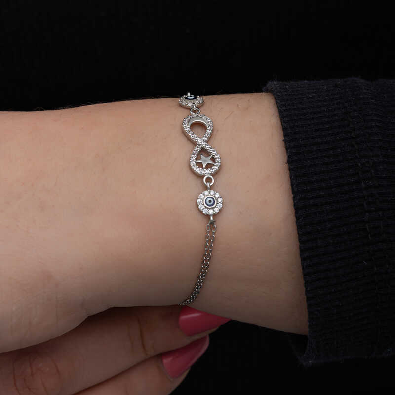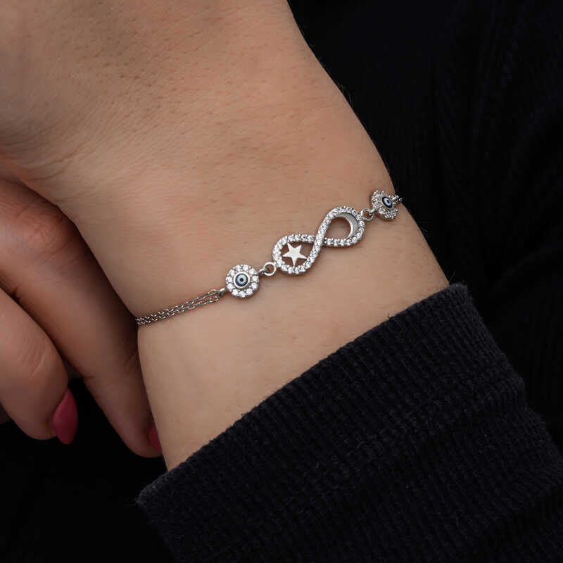 Gumus Ay Yildiz Nazarli Sonsuzluk Kadin Bileklik