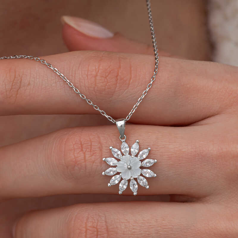Gumus Beyaz Manolya Cicegi Kadin Kolye
