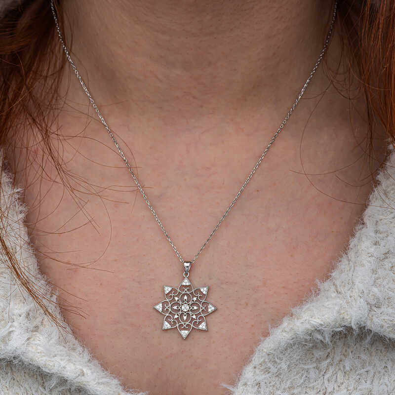 Gumus Cicek Desenli Kadin Kolye