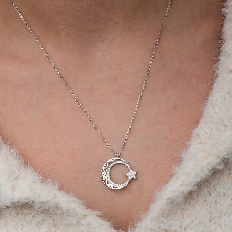 Gumus Desenli Ay Yildiz Kadin Kolye