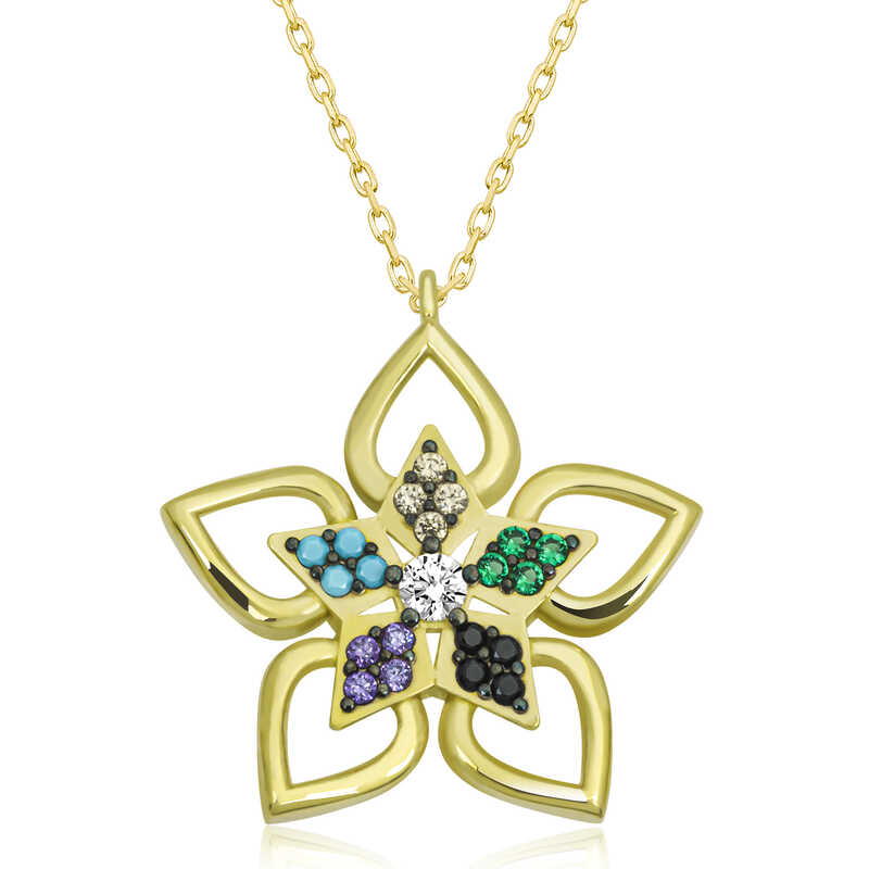 Gumus Gold Renkli Tasli Cicek Kadin Kolye