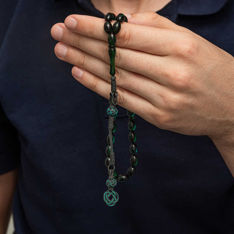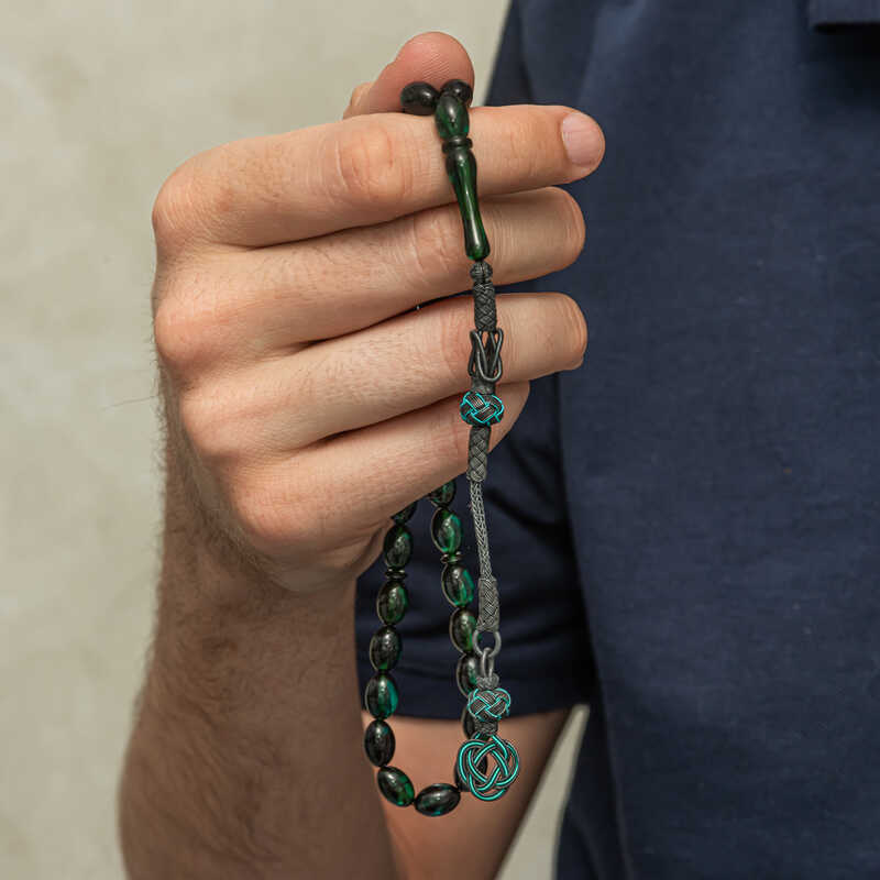 Gumus Kazaz Puskullu Yesil Sikma Kehribar Tesbih