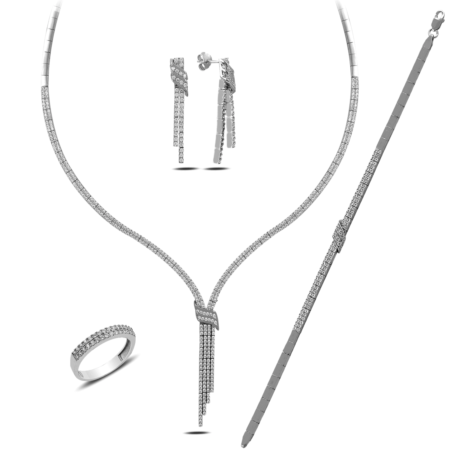 Modern cizgilerle klasik sikligi bulusturan Gumus Zirkon Tasli Kemerli Su Yolu Kadin Set, zarafetiyle dikkat ceken ozel bir tasarimdir. Su yolu formunda dizilmis zirkon taslar, kemerli detayla birleserek sete guclu ve sofistike bir karakter kazandirir. Isigi kusursuz sekilde yansitan zirkon taslar, her ortamda etkileyici bir parlaklik sunar. Kolye, kupe, bileklik ve yuzukten olusan bu uyumlu set; davetlerde, ozel gunlerde ve sikligini on plana cikarmak istedigin her an rahatlikla tercih edilebilir. 925 ayar gumusten uretilen set, kaliteli isciligi ve zamansiz tasarimi sayesinde uzun sureli kullanim saglar. Hem klasik hem modern tarzlara kolayca uyum saglayan bu ozel tasarim, hediye secenegi olarak da one cikar. Gumus ve degerli taslar nedeniyle belirtilen ortalama urun agirliginda ± %10 sapma olabilmektedir.
