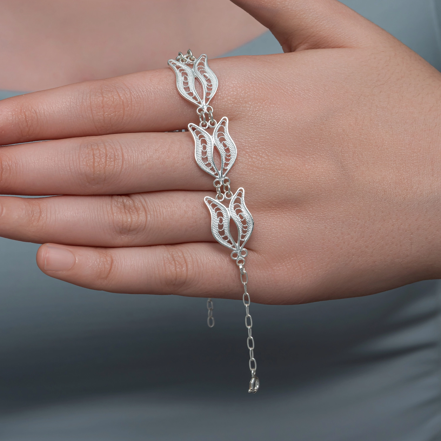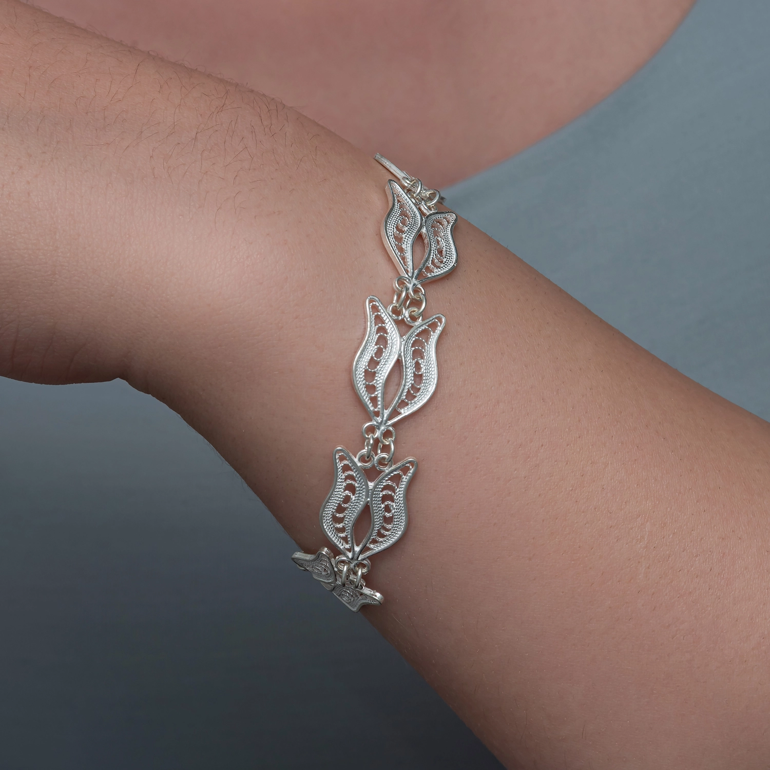 Gumus Lale Motifli Telkari Kadin Bileklik, geleneksel telkari sanatinin inceligini modern tasarim cizgileriyle bulusturan ozel bir aksesuardir. El isciligiyle sekillendirilen zarif lale motifi, bileklige hem estetik hem de anlamli bir dokunus kazandirir. Saf gumusun parlakligiyla butunlesen detayli islemeler, urunu hem gunluk kullanima uygun hem de ozel gunler icin ideal bir taki hâline getirir. Hafif yapisi sayesinde bilekte rahatlik sunarken, dayanikli formu uzun yillar guvenle kullanilmasini saglar. Zarafetini stiline yansitmak isteyen kadinlar icin sik ve anlamli bir secimdir.Gumus ve degerli taslar nedeniyle belirtilen ortalama urun agirliginda ± %10 sapma olabilmektedir.
