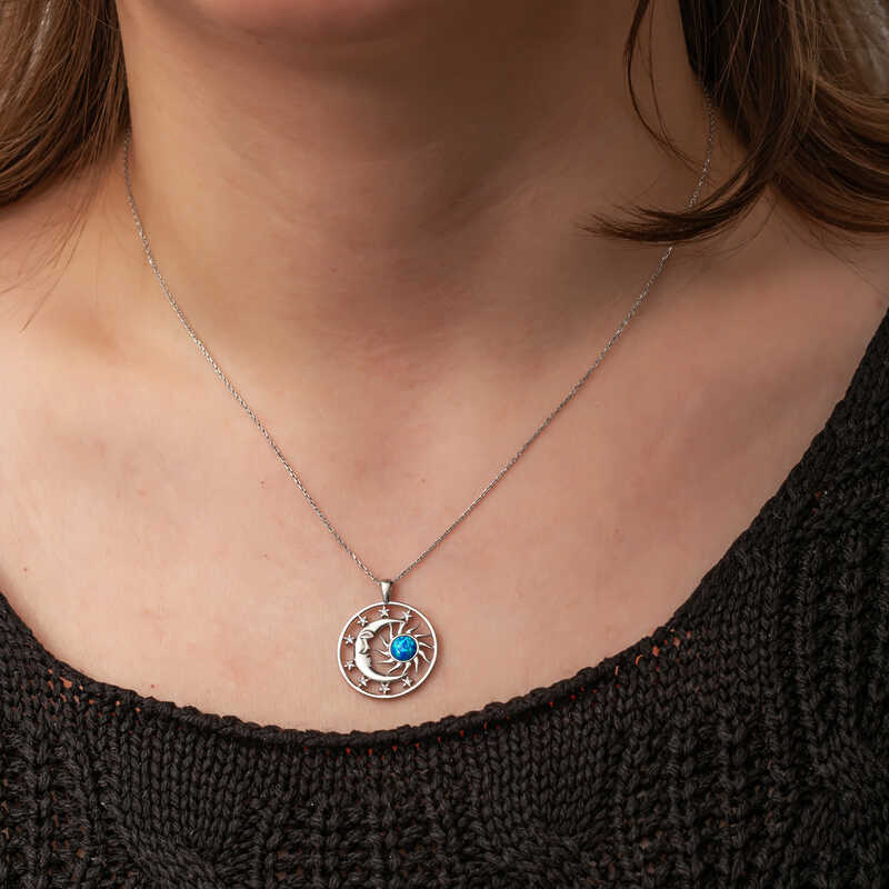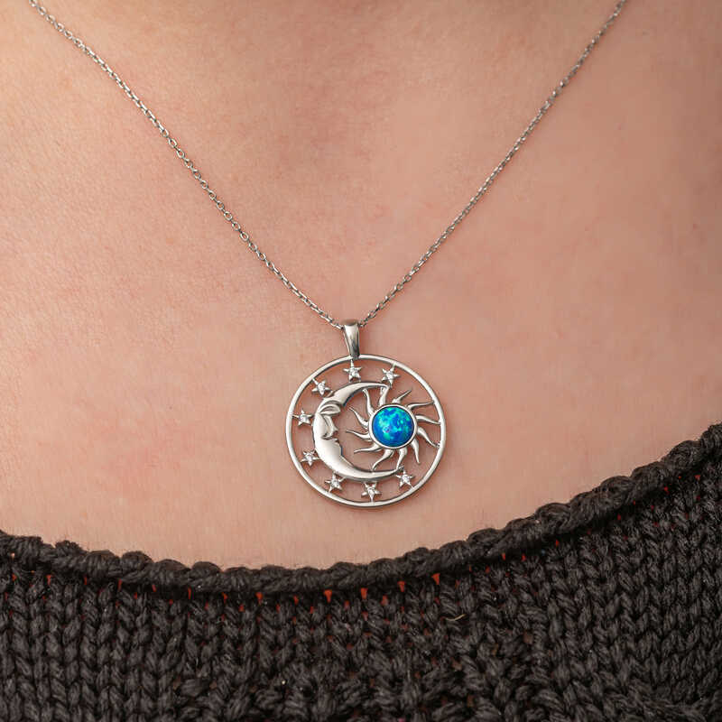 Gumus Opal Mavi Tasli Ay Gunes Kadin Kolye