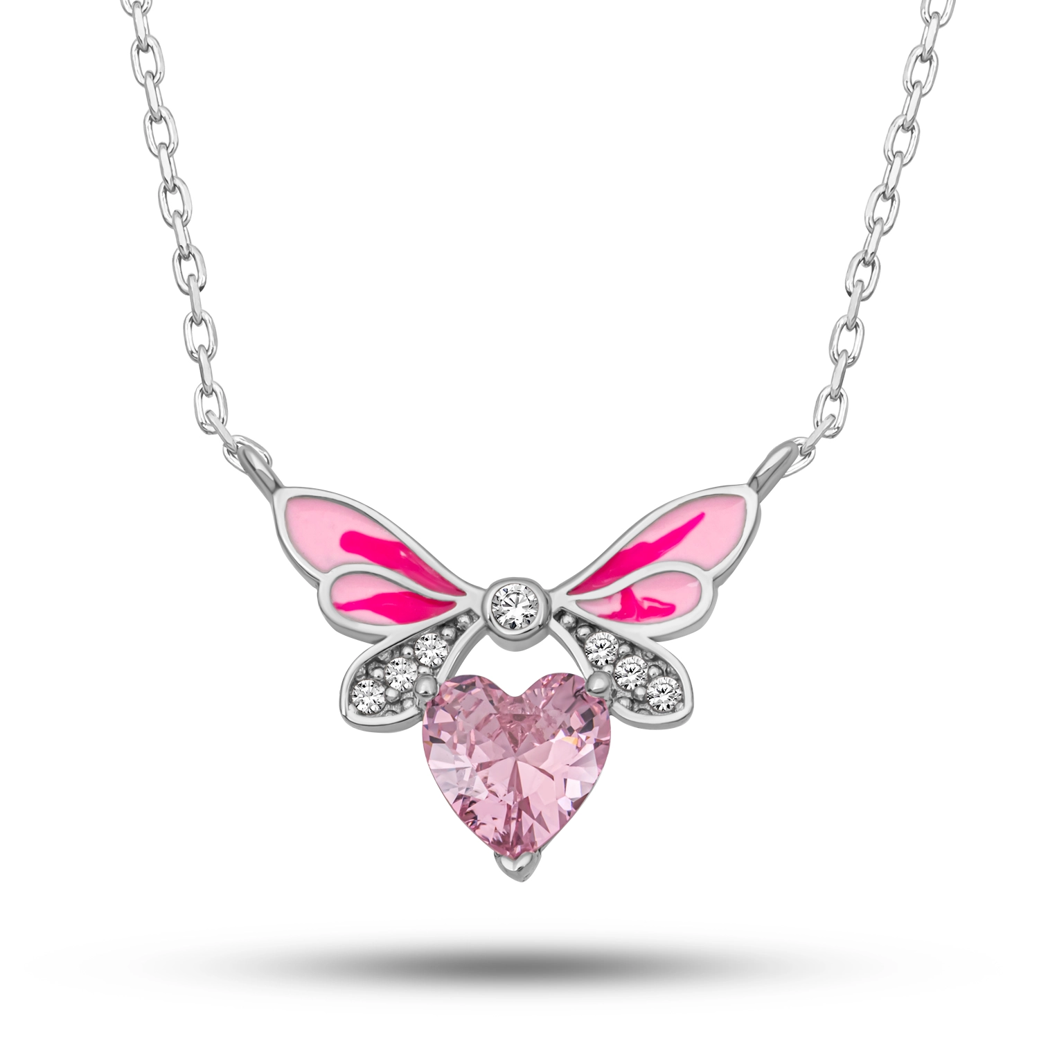 Gumus Pembe Kalp Peri Kanatli Kolye