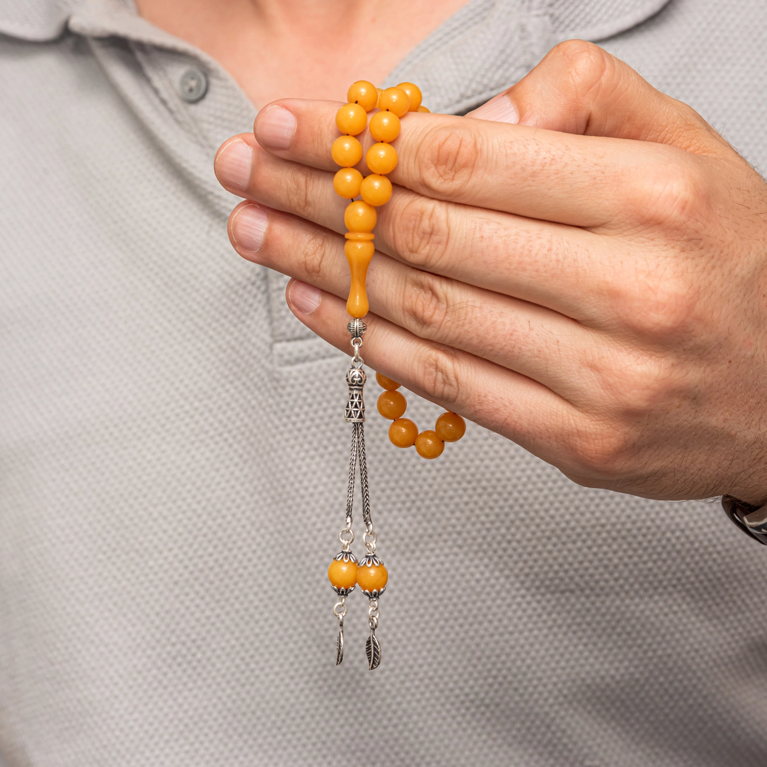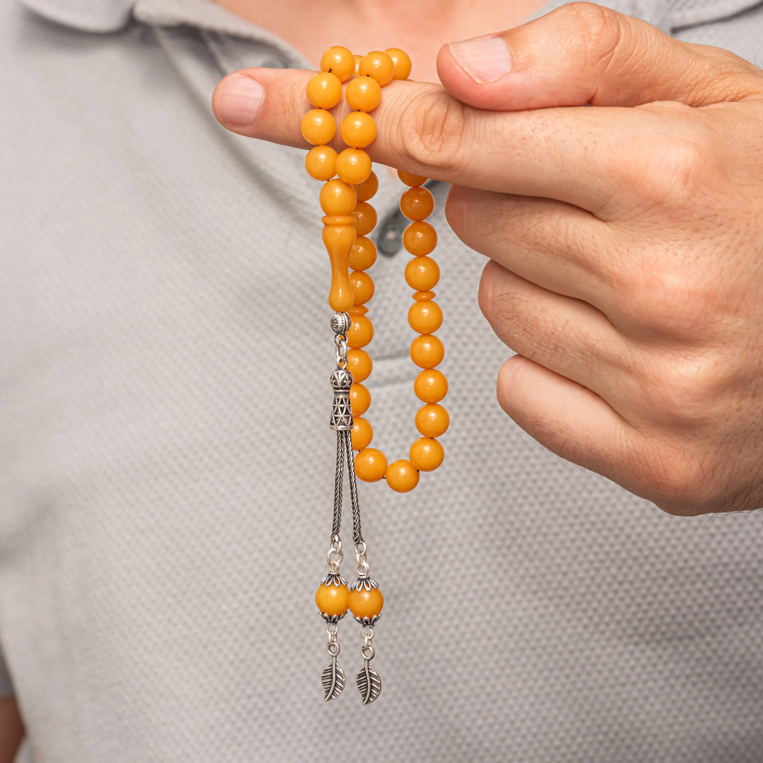 Gumus Puskullu Sari Yuvarlak Sikma Kehribar Tesbih