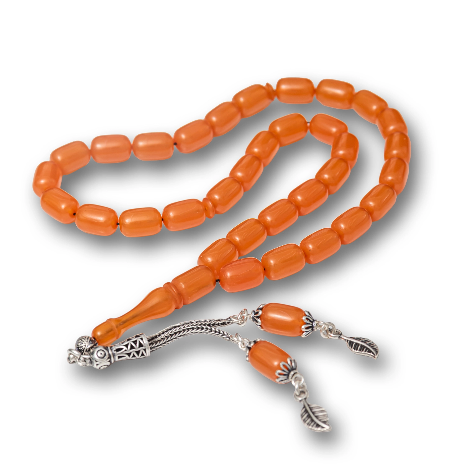 El isciliginin zarafetini tasiyan Gumus Puskullu Turuncu Kapsul Kesim Sikma Kehribar Tesbih, goz alici turuncu rengi ve estetik kapsul kesimiyle hem koleksiyon severlerin hem de gunluk kullanicilarin begenisini toplar. Parlak yuzeyi ve dengeli dizilimi sayesinde akici ve rahat bir cekim sunarken, gumus puskul detaylari tesbihe asil ve otantik bir hava kazandirir.Ustalikla islenen her detay, geleneksel tesbih kulturunu modern cizgilerle bulusturur. Manevi degeri yuksek, gosterisli yapisiyla hem kendiniz hem sevdikleriniz icin degerli ve anlamli bir secenektir. Gumus ve degerli taslar nedeniyle belirtilen urun agirliginda ± %10 sapma olabilmektedir.