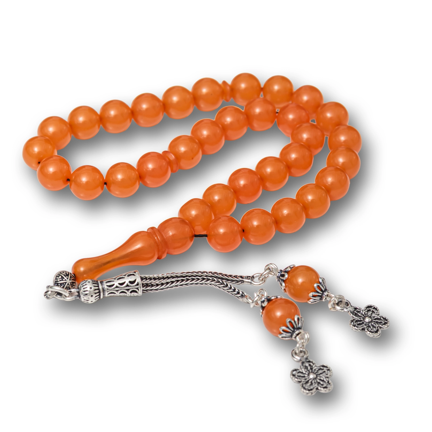 Gumus Puskullu Turuncu Yuvarlak Sikma Kehribar Tesbih