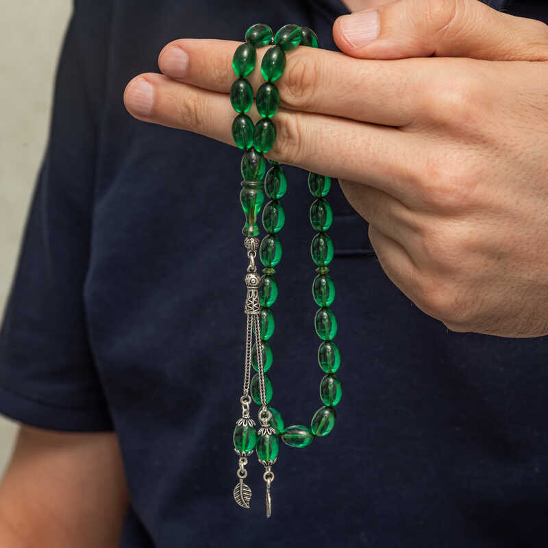 Yesil kehribar taslarindan yapilmis,parlak ve seffaf gorunumuyle dikkat ceker.Kehribar,eski caglardan beri sifa ve koruma amaciyla kullanilmistir.Yesil renk yenilenme,yasam enerjisi ve doga ile bag kurmayi temsil eder.Ayrica, psikolojik rahatlik ve dualarin etkisini guclendirdigine inanilir.Gumus puskuller ve detaylar tasarimina zarif bir dokunus saglar.Bu tesbih,hem kullanisliligi hem de estetik gorunumuyle sevdiginiz kisilere ozel hediye secenekleri arasinda bulunabilir.Sikma kehribar tesbih modeli diger kehribar tesbih modellerinde oldugu gibi tamamen el emegi ile imal edilmistir.