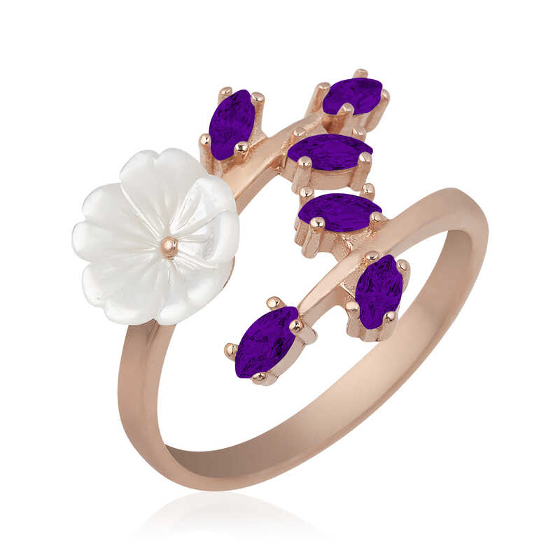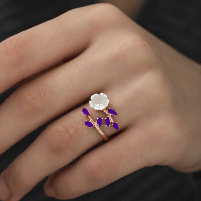 Havalarin isinmasiyla birlikte canlanan doga, ilkbaharin geldigini mujdeler. Yesile burunen agaclar, rengarenk cicekler acar ve essiz kokulari ile bizi karsilar. Dogadan ilham alinarak tasarlanan bu yuzuk yeniden dogusu ilkbahari sembolize etmektedir. Bu sik yuzuk; dogum gunu hediyesi, sevgililer gunu veya ozel gunlerde tercih edilebilecek mukemmel bir secenektir. Yuzuk; 925 ayar gumusten imal edilmistir. Gumus uzerine rose kaplama yapilmistir. Diger yuzuklerde oldugu gibi gumus mor yaprakli bahar cicegi yuzuk de el emegi ile uretilmistir. Gumus ve degerli taslar nedeniyle belirtilen ortalama urun agirliginda ± %10 sapma olabilmektedir.