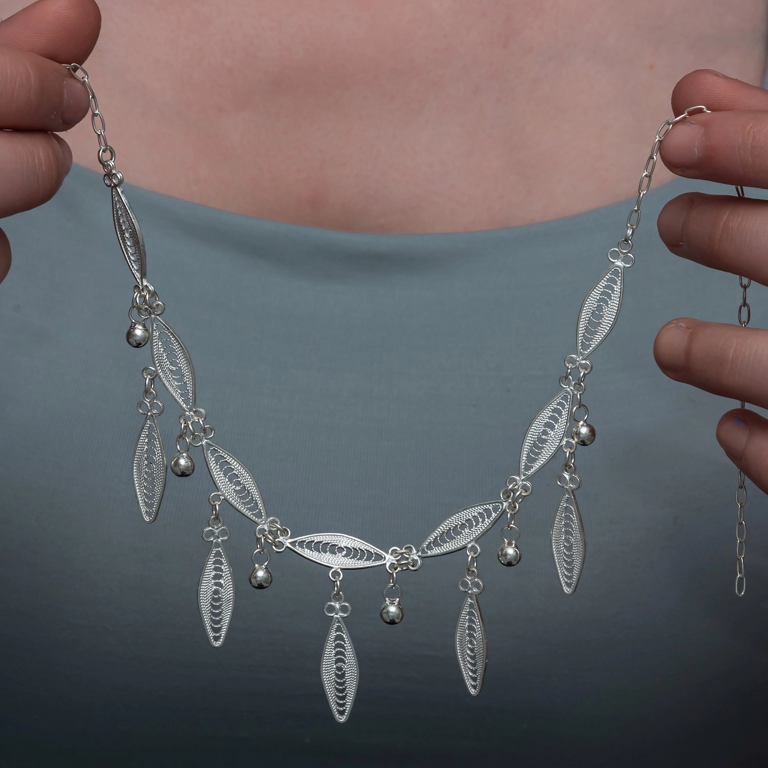 Gumus Sonsuz Yaprak Telkari Kadin Kolye, dogadan ilham alan yaprak motiflerini geleneksel telkari sanatinin inceligiyle bir araya getirir. Uzun oval formlu telkari detaylar kolye boyunca zarif bir akis olustururken, sallantili gumus top suslemeler tasarima canlilik ve isilti katar. Ince ve dengeli yapisi sayesinde boyunda estetik ve feminen bir durus sergiler.925 ayar gumusten uretilen bu ozel kolye, hafifligi sayesinde gun boyu konforlu bir kullanim sunar. Hem gunluk kombinlere dogal bir zarafet katmak hem de ozel gunlerde sik bir tamamlayici olmak icin ideal bir secimdir. Ayarlanabilir zinciri farkli boy olculerine uyum saglar. El isciligi detaylari ve zamansiz tasarimiyla sevdikleriniz icin de anlamli bir hediye alternatifi olarak one cikar.Gumus ve degerli taslar nedeniyle belirtilen ortalama urun agirliginda ± %10 sapma olabilmektedir.