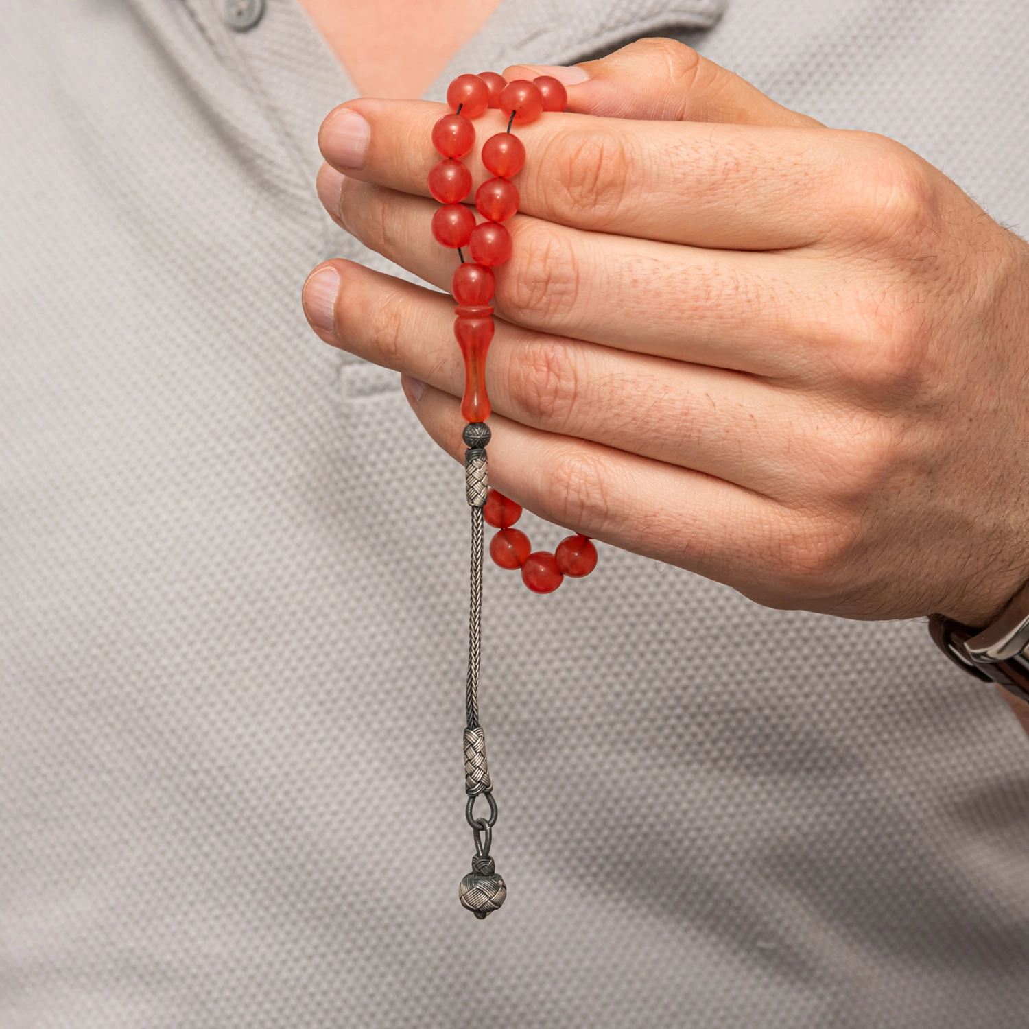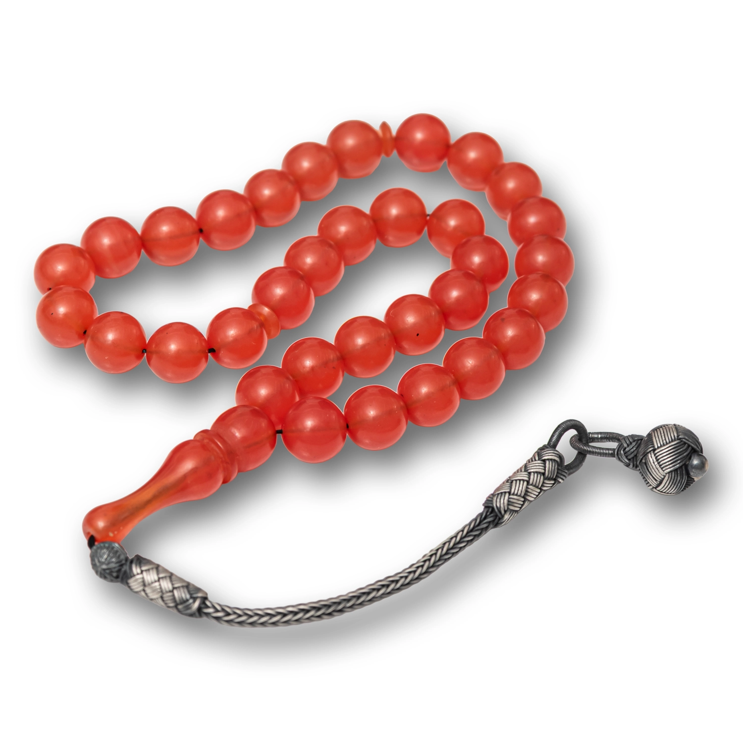 Gumus Top Kazaz Puskullu Yuvarlak Sikma Kehribar Tesbih