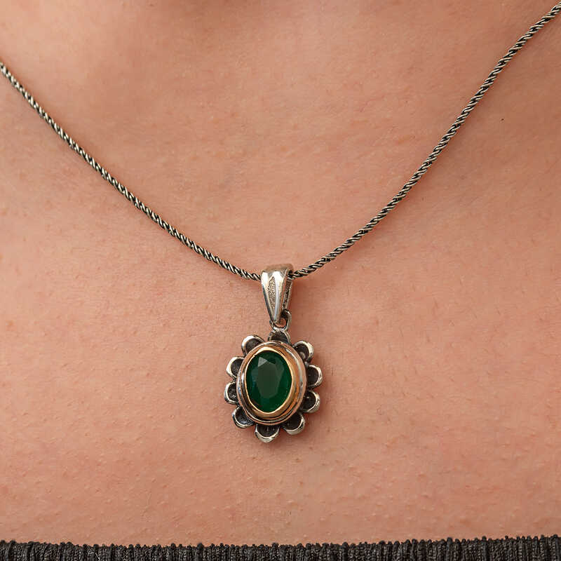 Gumus Yesil Cicek Desenli Otantik Kadin Kolye