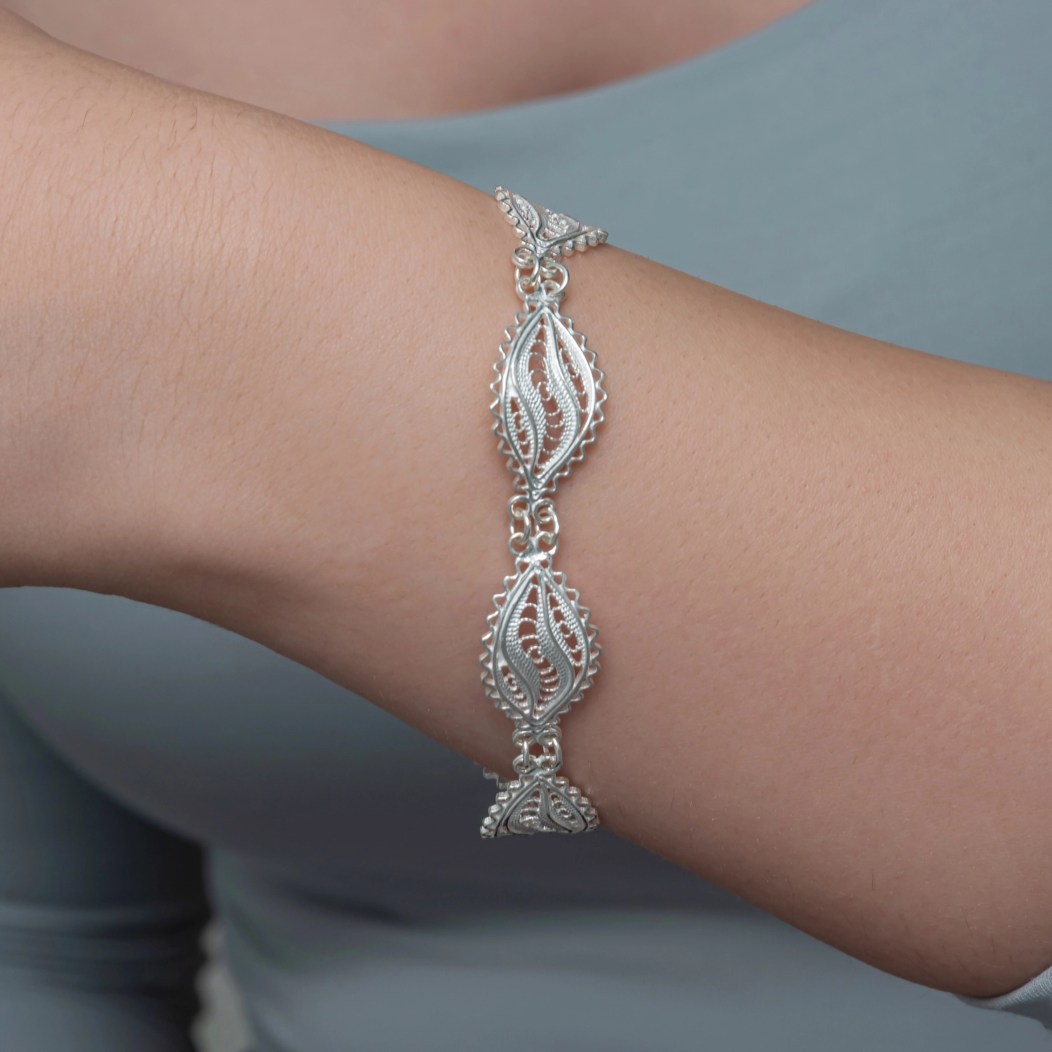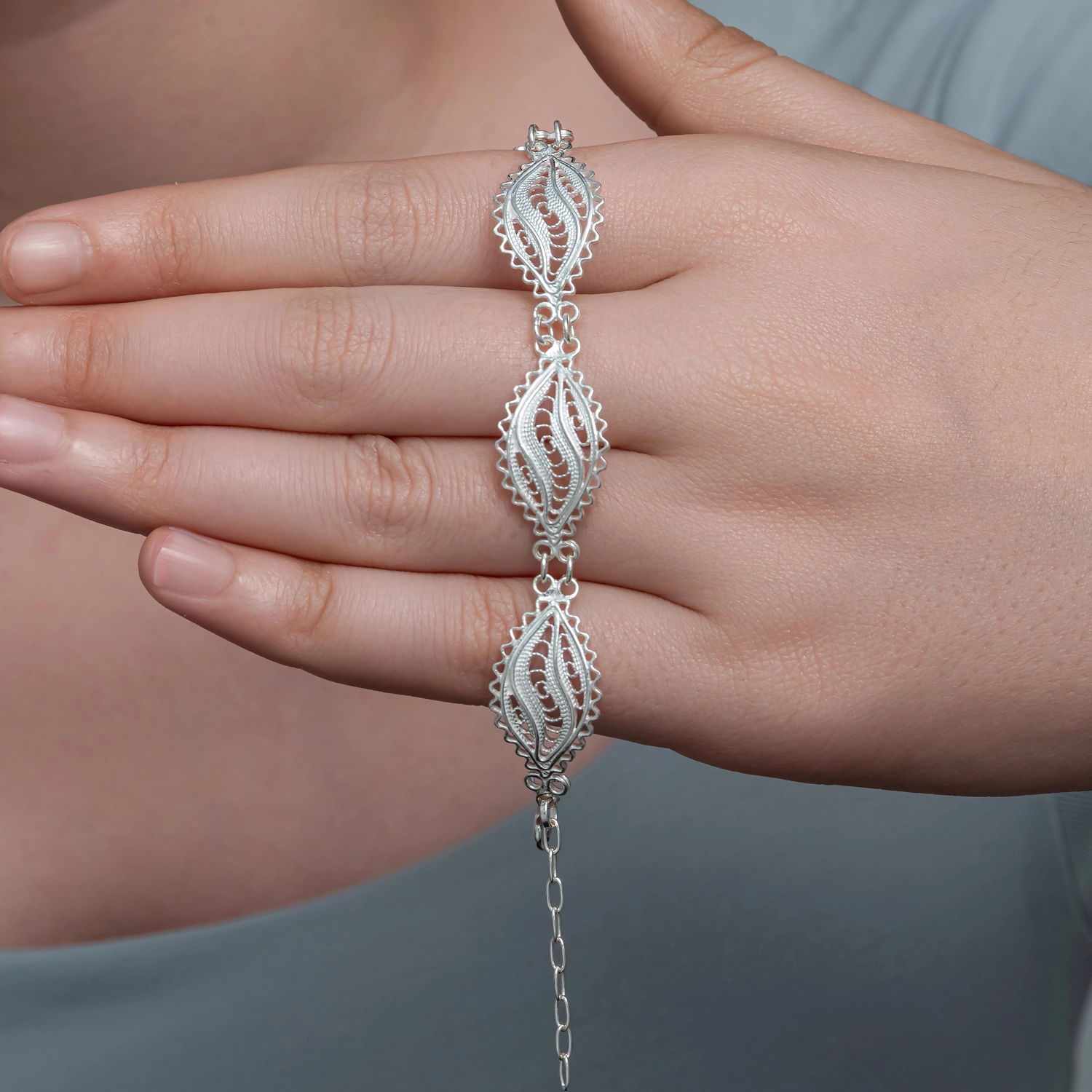 Doganin estetiginden ilham alinarak tasarlanan Gumus Zarif Yaprak Telkari Kadin Bileklik, geleneksel telkari sanatinin ince ve detayli isciligini modern bir zarafetle bulusturuyor. Yaprak formundaki motifler, usta el isciligiyle orulmus telkari desenleriyle bir araya gelerek bilekte dikkat cekici bir isilti olusturur.925 ayar gumusten uretilen bu ozel bileklik, hafif ve konforlu yapisiyla gun boyu rahatlikla kullanilabilir. Ayarlanabilir zinciri sayesinde farkli bilek olculerine uyum saglar ve hem gunluk kombinlere hem de ozel davetlere sik bir tamamlayici olarak eslik eder. Zamansiz tasarimi, ince isciligi ve zarif durusuyla on plana cikan bu bileklik, sevdiklerine sik ve anlamli bir hediye arayanlar icin de mukemmel bir secimdir.Gumus ve degerli taslar nedeniyle belirtilen ortalama urun agirliginda ± %10 sapma olabilmektedir.