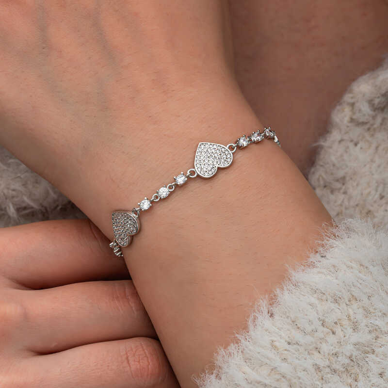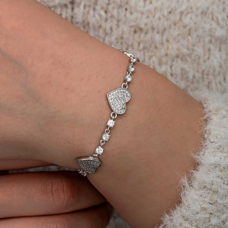 Gumus Zirkon Tasli Sirali Kalp Kadin Bileklik