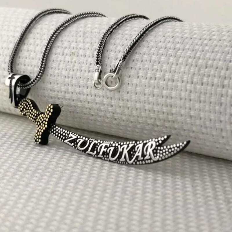 Hz. Ali Uhud savasinda cokca kahramanlik gostermistir. Savasta Peygamber Efendimizi korumak isterken kilici kirilir.Bunu goren Peygamber Efendimiz kendi kilici olan Zulfikar’i kendisine vermistir. Kilicin keskinligi ile diger kiliclari ortadan ikiye ayirmis ve savaslarda destanlar yazdirmistir. Hz. Ali Zulfikar kiliciyla beraber savaslardadir artik... Hz. Alinin vefatindan sonra kilicin cennete goturuldugu biliniyor.Bir baska rivayete gore ise Dicle ve Firat nehirlerinin arasinda oldugu biliniyor. Islam ordularina hukmedecek kisi o kilicin sahibi olup ordularin baskomutani olacaktir. Bu sik kolye; dogum gunu hediyesi, sevgililer gunu hediyesi veya hediye olarak ozel gunlerde tercih edebilirsiniz. Kolye; 925 ayar gumusten imal edilmistir. Gumus uzerine oksit kaplama yapilmistir. Oksit kaplama yapilan gumus kolyeler parlakligini uzun sure muhafaza eder, gumuse siyah rengi verir. Tum kolyelerde oldugu gibi bu gumus zulfikar kilici kolye de tamami el emegi ile uretilmistir. Uzerinde bulunan taslar zirkondur. Gumus ve degerli taslar nedeniyle belirtilen ortalama urun agirliginda ± %10 sapma olabilmektedir.
