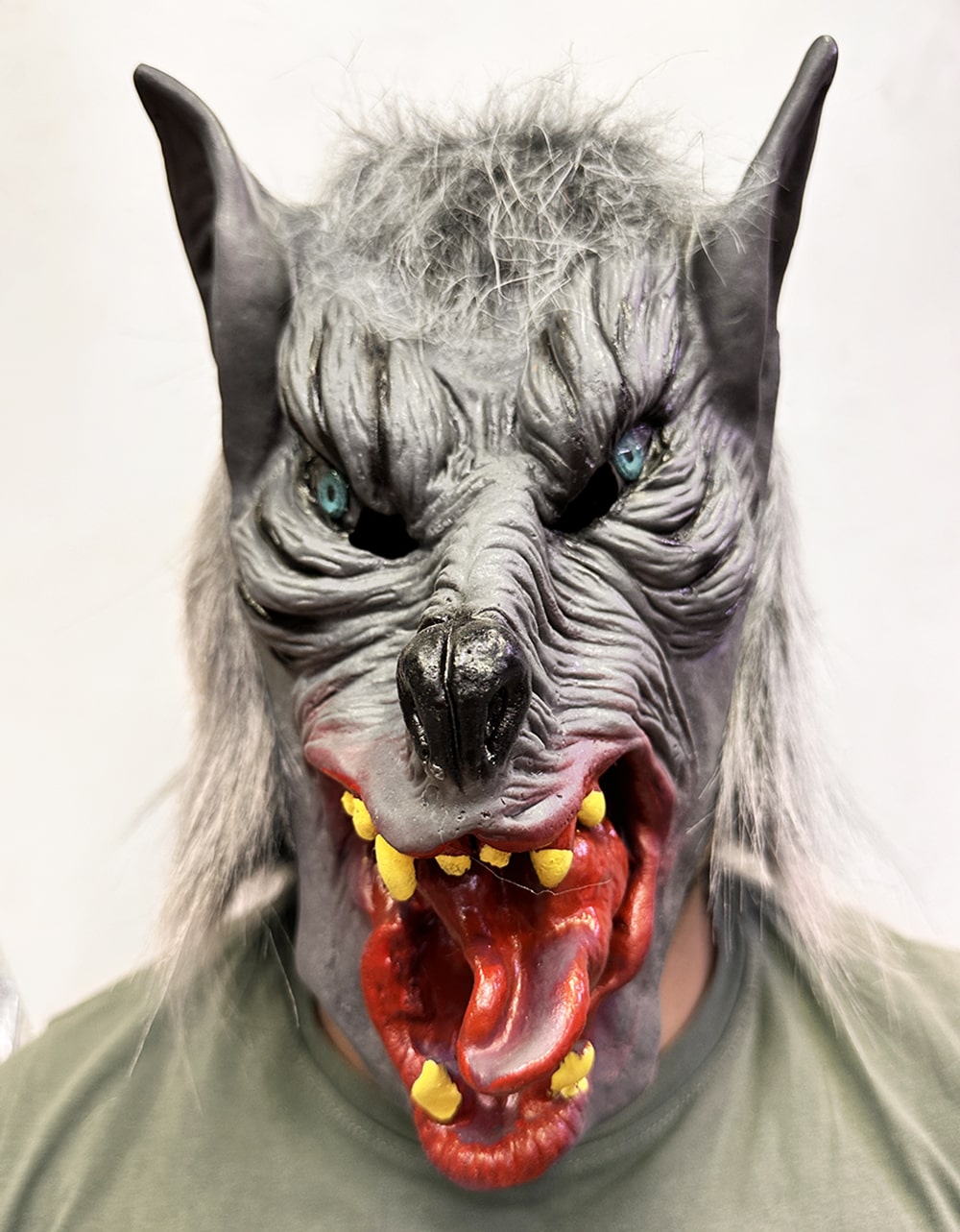 Kafaya Tam Gecmeli Lateks Dil Cikaran Mavi Gozlu Kurt Maskesi