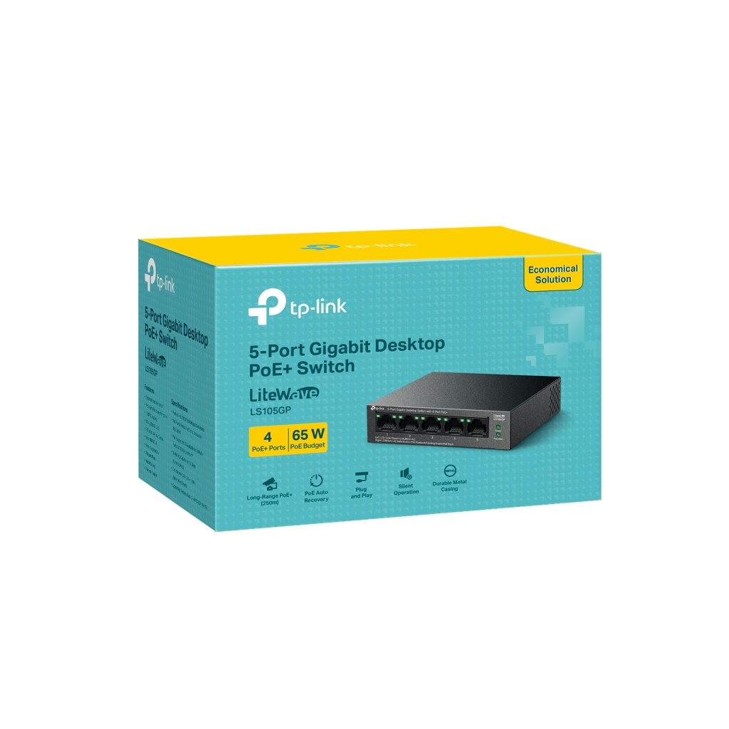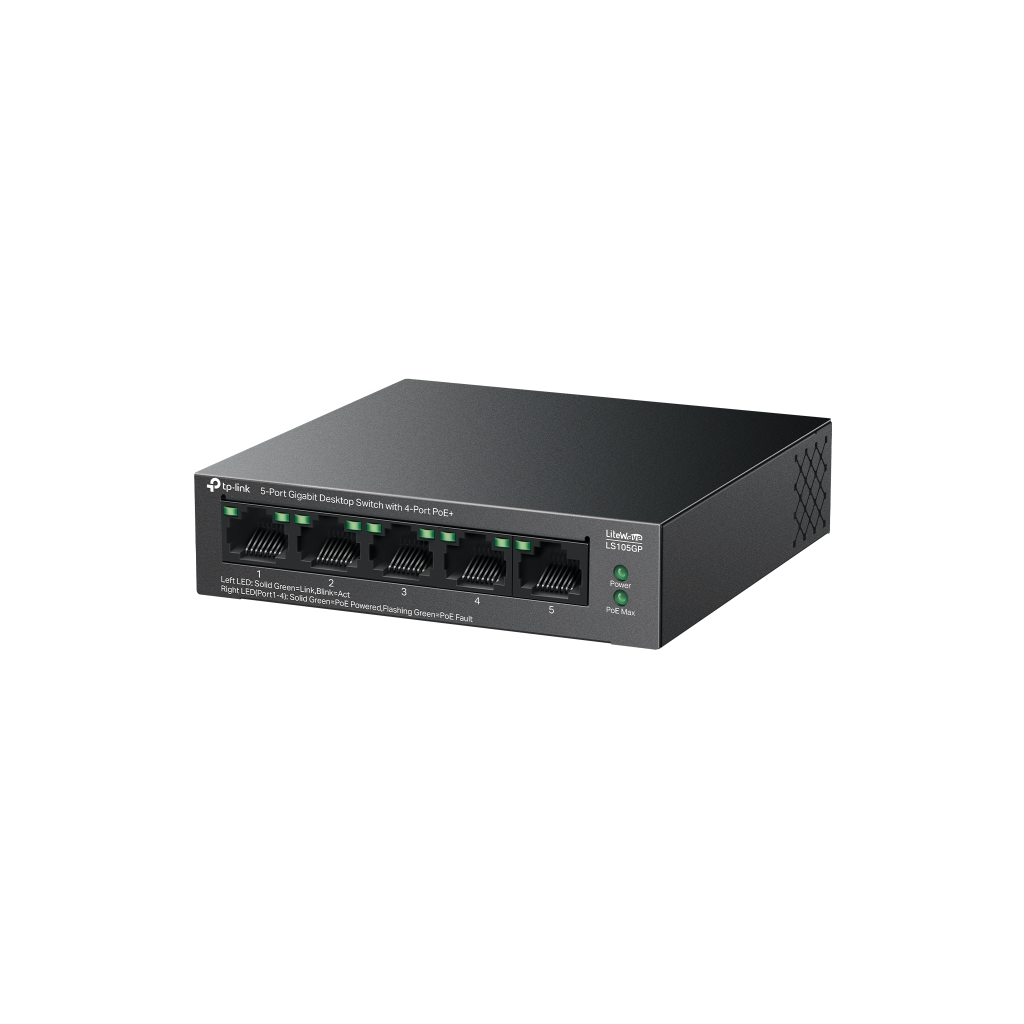 TP-LINK LS105GP, Green Tech, 5 Port, GigaBit, 4 Port PoE 65W, Metal Kasa, Yonetilemez, Masaustu Switch