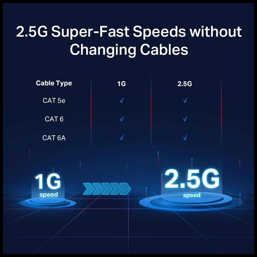 - Kolay ve Zahmetsiz Kablo Baglantisi: Cat 6 kabloya yükseltme ihtiyaci olmaksizin aninda 2.5 Gbps'ye yükseltir, kablo maliyetleri ve karmasasini azaltir.