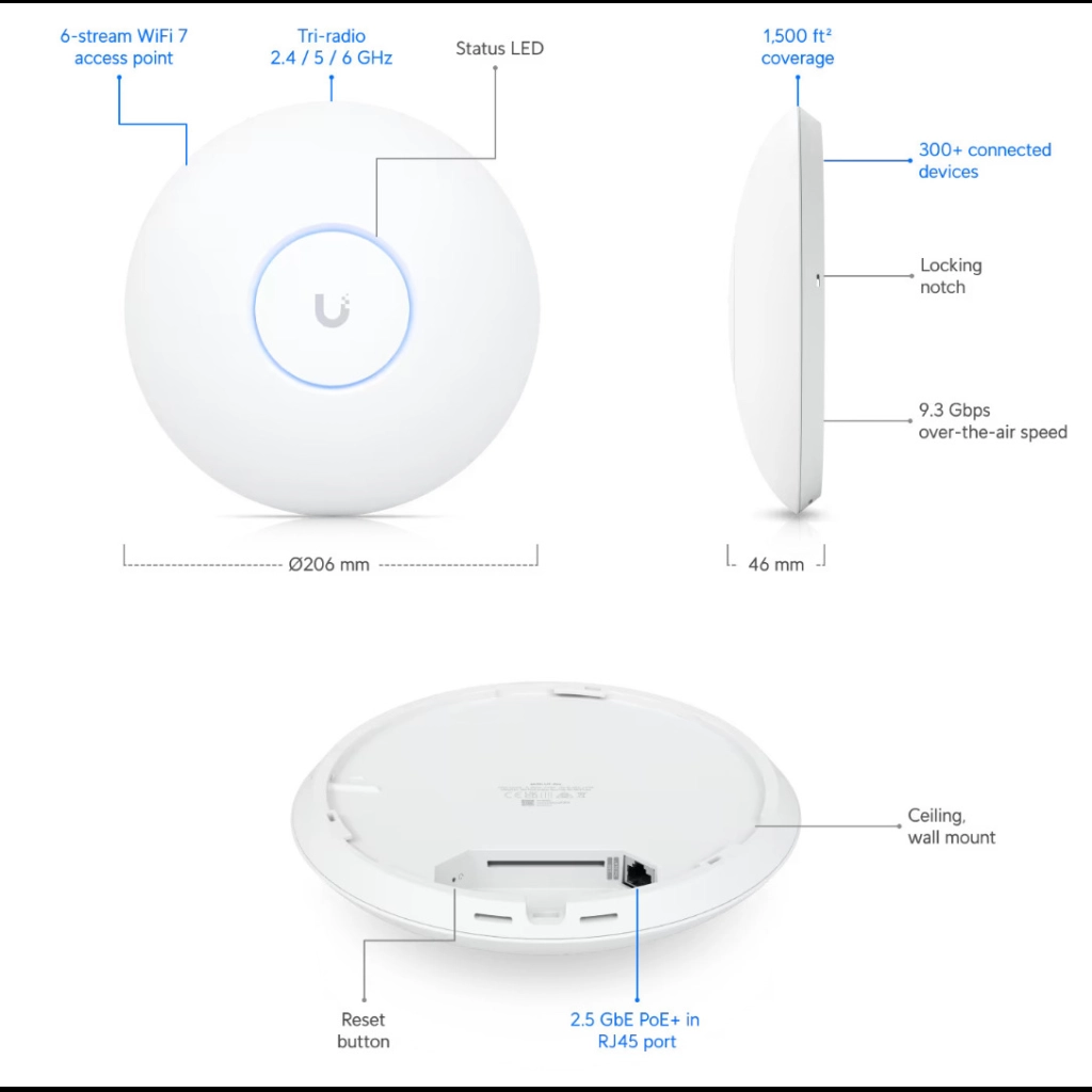 UBNT U7 Pro, 1.5G GHz Qualcomm 4 Çekirdekli IPQ5322 islemcisi, 1GB DDR4 Ram, Qualcomm OCN6274 WiFi7 (802.11be) radyo karti ile 2.4Ghz 22dBm 4dBi, 5Ghz 26 dBm 6dBi ve 6 GHz 23dBm 5.8Dbi frekanslarinda kablosuz kapsama alani üretebilirken, 802.3af/at PoE+ destekli 2.5G ethernet portu yüksek hizli kablosuz iletisim hizlarina ulasmaniza olanak saglamaktadir.