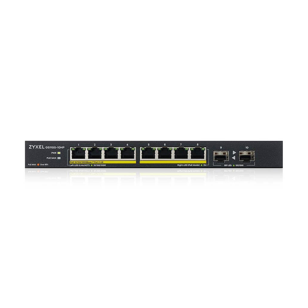 ZyXEL GS1100-10HP, 8 Port, Gigabit, PoE 130W, 2 Port GigaBit SFP, Yonetilemez, Masaustu Switch